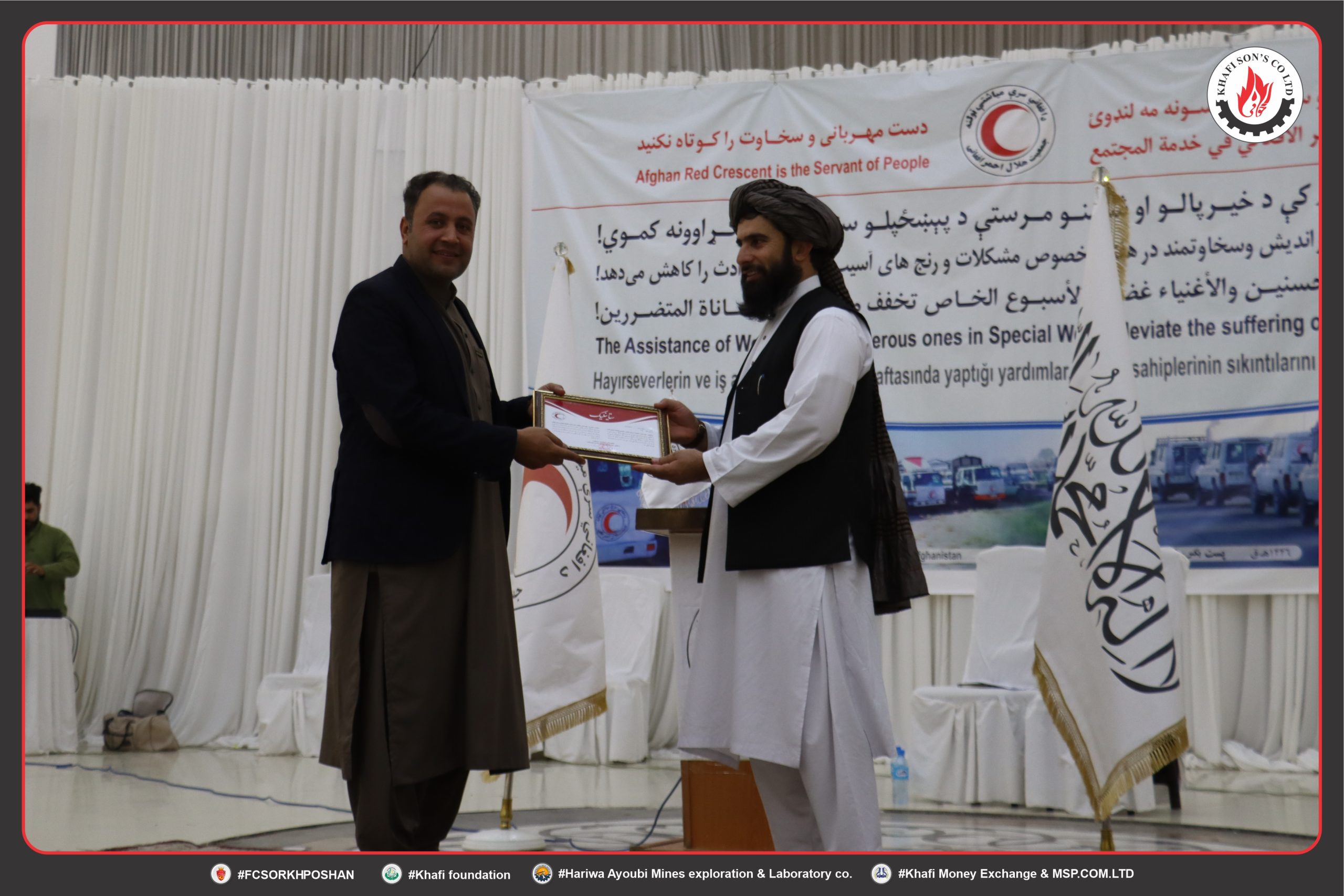 هلال احمر افغانی ازمحترم فیض احمد “خوافی” ریئس هلدینگ تجارتی پسران خوافی تقدیر به عمل آورد.